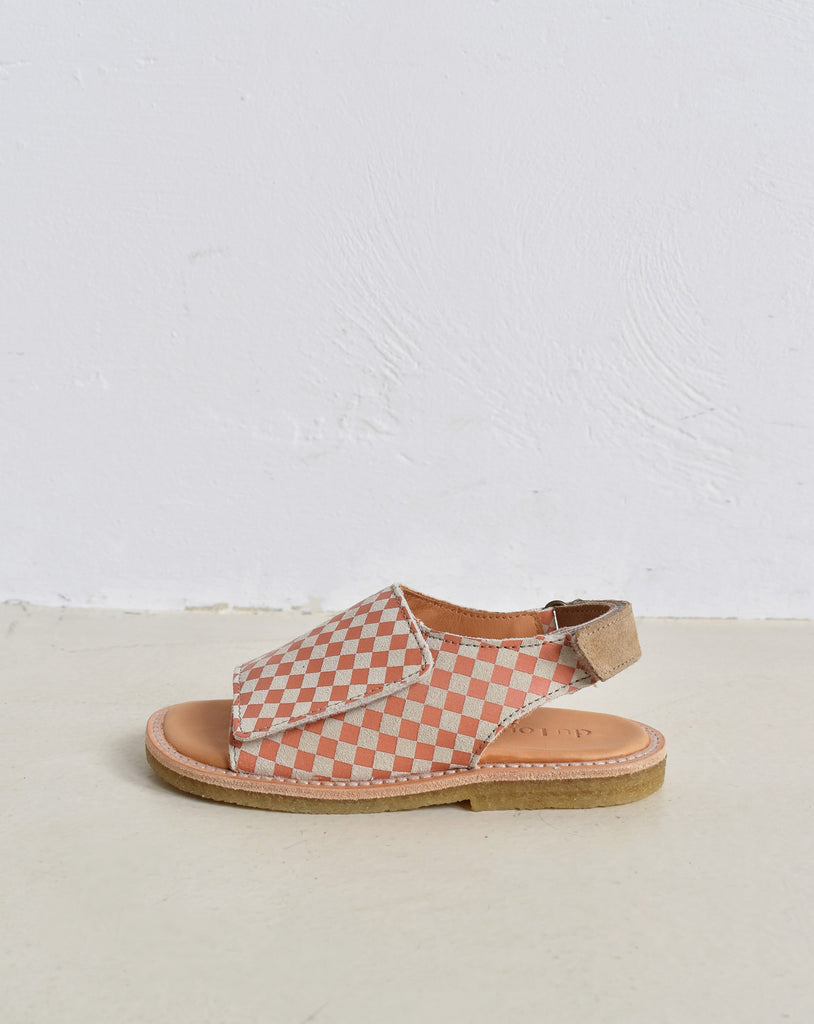 These 'du Veda' sandals are designed for both boys and girls. The sandals are made of premium suede leather. The sole is made of natural crepe and is comfortable and flexible. The sandal has a large adjustable velcro strap both on top of the foot and at the ankle, which makes it fit well.